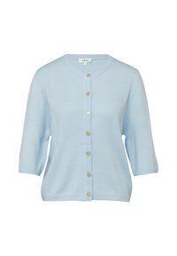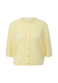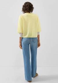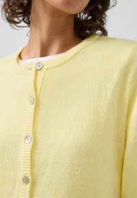 Frau mit lockigem Haar, die einen blassgelben, kurzärmeligen, geknöpften Cardigan über einem weißen, langärmeligen Oberteil und hellblauen Jeans trägt.