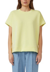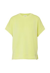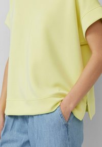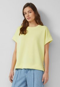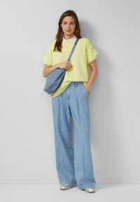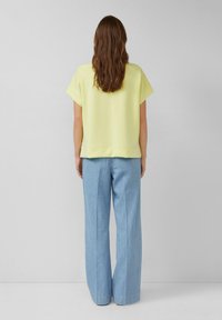 Frau mit langem braunem Haar, die ein locker sitzendes, blassgelbes Kurzarmoberteil und hellblaue Jeans trägt, stehend vor einem einfarbigen grauen Hintergrund.
