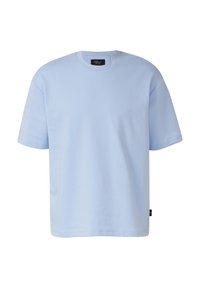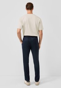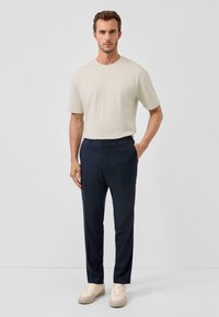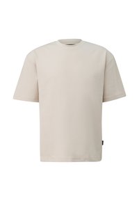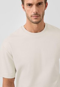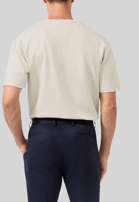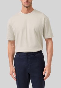 Beiges T-Shirt mit kurzen Ärmeln und rundem Ausschnitt, getragen mit dunkelblauen Hosen; glatter Stoff, lockere Passform, schlichtes Design ohne Muster.