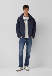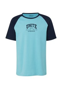 Junger Mann trägt ein weißes T-Shirt mit marineblauen Raglanärmeln und dem Aufdruck "UNITE LET'S SYNERGIZE", kombiniert mit blauen Jeans, stehend vor einem grauen Hintergrund.