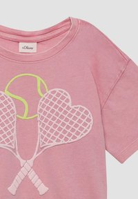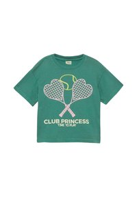 Rosa Kleinkind-T-Shirt mit gekreuzten Tennisschlägern, einem Tennisball und grünem Text "CLUB PRINCESS TIME TO PLAY" auf der Vorderseite.