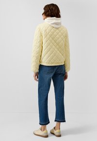 Frau trägt eine hellgelbe Steppjacke mit diagonaler Steppung und vorderen, mit Knöpfen versehenen Klappentaschen, kombiniert mit blauen Jeans.