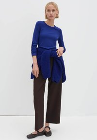 Blaues langärmeliges Oberteil aus glattem, elastischem Material mit rundem Ausschnitt und figurbetontem Schnitt, kombiniert mit braunen, weit geschnittenen Hosenbeinen.