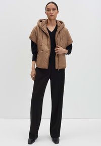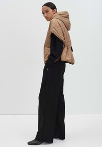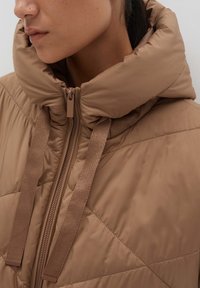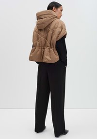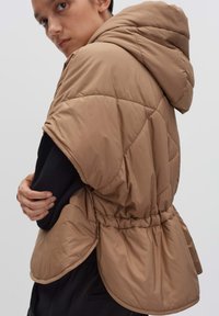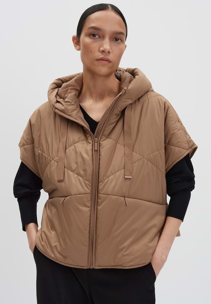 Braunte Pufferweste mit durchgehendem Reißverschluss, übergroßer Kapuze und kurzen Ärmeln. Verfügt über diagonale Nähte und Stoffbänder am Hals.