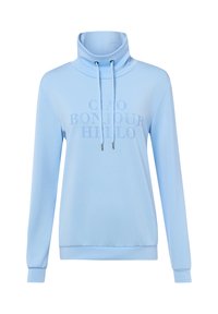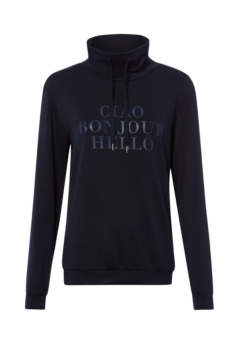 Marineblauer Langarm-Sweatshirt mit hohem Kordelzug am Kragen, auf der Brust prangt der Schriftzug "CIAO BONJOUR HELLO" in großen Buchstaben.