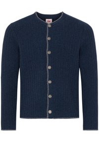 Navyblauer gerippter Strickcardigan mit rundem Kragen, silbernen Knöpfen und kontrastierenden Nähten entlang der Kanten. Lange Ärmel, weicher Stoff.
