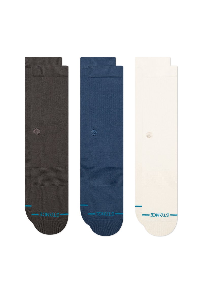 Drei Paar Socken: dunkelbraun, marineblau und cremefarben. Jede verfügt über eine glatte Strickstruktur und ein kleines Logo im oberen Bereich.