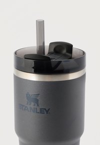 Dunkelgrauer Stanley isolierter Becher mit transparentem Deckel und Trinkhalm vor einem schlichten hellen Hintergrund.