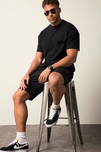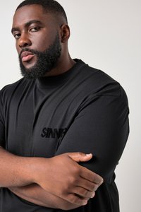 Mann mit Bart, der ein schwarzes T-Shirt mit der Aufschrift "SINNER" auf der Brust, helle Jeans und ein schwarzes Armband trägt, steht vor einem schlichten Hintergrund.