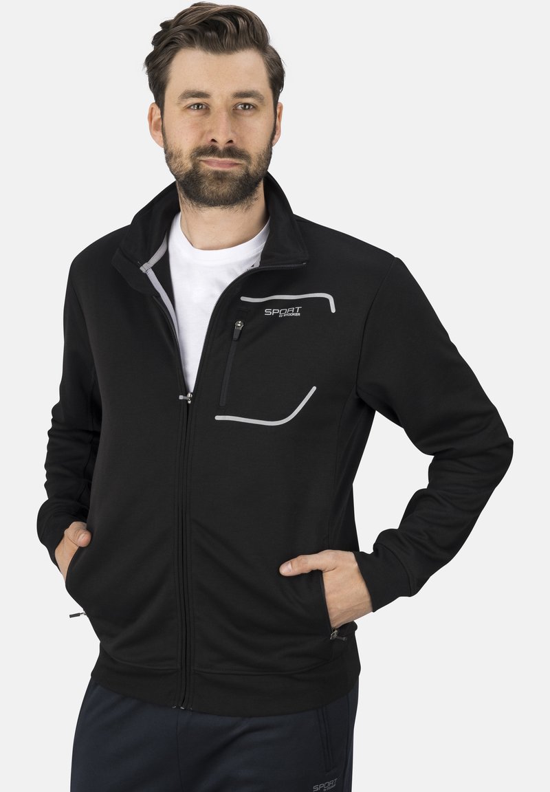 Schwarze Sweatjacke mit Reißverschluss aus weichem Material, hohem Kragen, hellgrauen Akzenten und einer Reißverschlusstasche auf der Brust. Zwei seitliche Taschen.