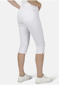 Weiße Capri-Jeans aus Baumwollmischung mit schlankem Schnitt, vorderen Taschen und einem Schlitz an dem Saum. Kombiniert mit weißen Turnschuhen.