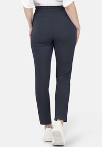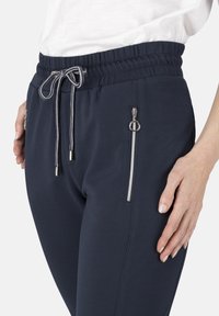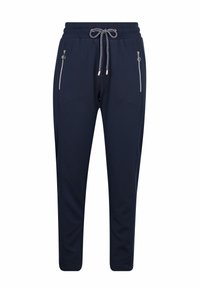 Marinefarbene Jogginghosen mit einem Kordelzugbund, seitlichen Reißverschlusstaschen, schmalem Schnitt und elastischen Bündchen, kombiniert mit weißen Sneakers. Glatte Textur.