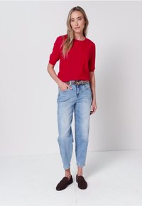 Frau trägt rotes kurzärmeliges Oberteil, blaue Jeans, Leopardenmuster-Gürtel und eine braune Schultertasche, steht vor einer hellen Wand.