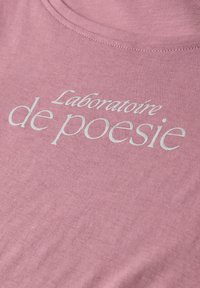 Frau mit lockigem Haar, die ein pinkes T-Shirt mit der Aufschrift "Laboratoire de poesie" und blaue Jeans trägt, schaut nach rechts vor einem hellgrauen Hintergrund.