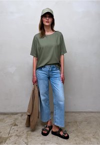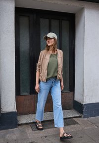 Frau mit hellbraunen Haaren, die ein olivgrünes kurzärmeliges Oberteil, hellblaue Jeans und eine beigefarbene Baseballkappe vor einfachem Hintergrund trägt.