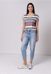 Dropped Shoulders - Rounded v- neck - Multicolored stripes - Linen look - T-Shirt print - bound green