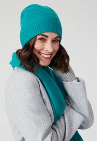 Teal gestrickte Mütze und passender Schal, aus weichem Stoff. Der Schal hängt über einem hellgrauen Mantel. Gestreifte Textur auf der Mütze sichtbar.