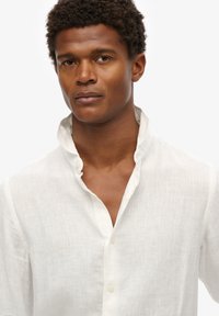Weißes Leinenhemd mit langen Ärmeln, Stehkragen, durchgehender Knopfleiste und gemanschetten Ärmeln. Kombiniert mit dunklen Hosen und einem braunen Gürtel.