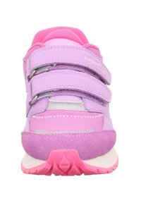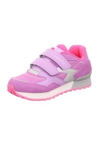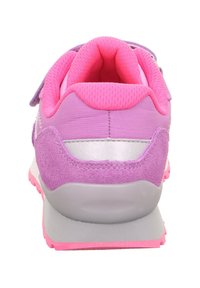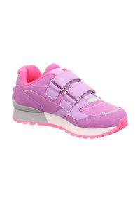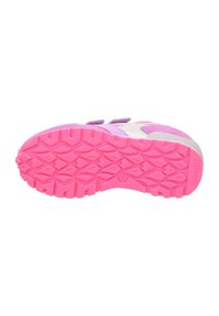 Lila und rosa Sneaker mit Klettverschluss, aus Wildleder und Textilmaterialien, mit einer strukturierten Gummisohle und reflektierenden silbernen Akzenten.