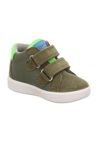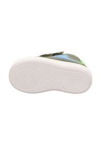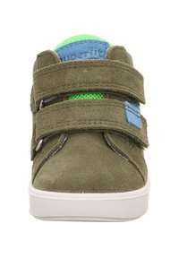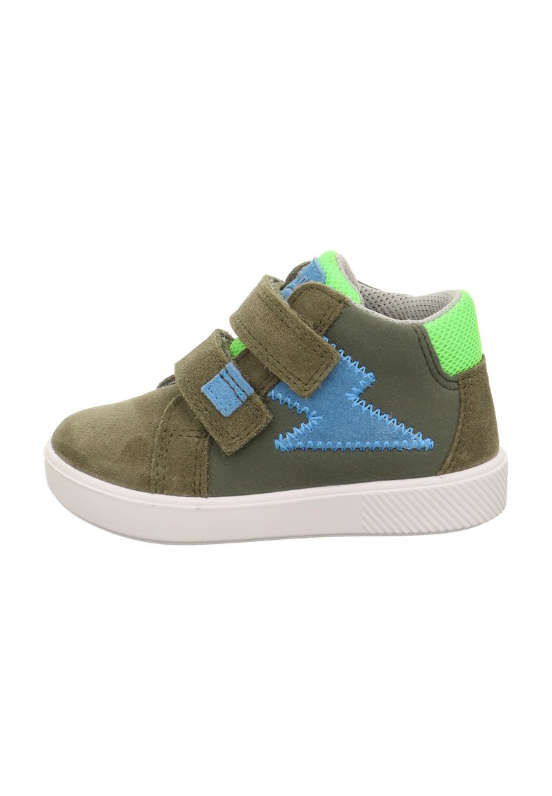 Grüne Wildleder-Sneaker mit blauer Zickzack-Stickerei, zwei Klettverschlussriemen und einem kräftig grünen Mesh-Kragen. Weiße Gummisohle.