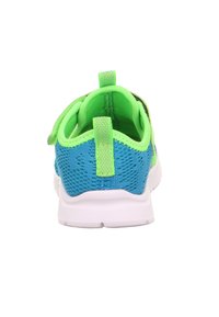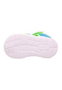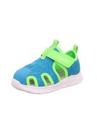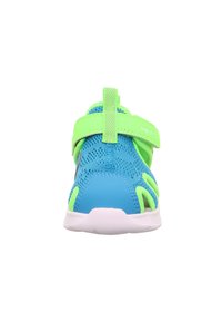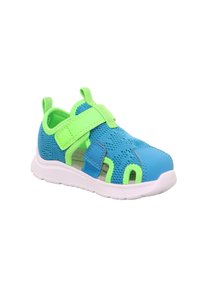 Kindersandalen mit einem Obermaterial aus blauem und grünem Mesh, offenem Design, verstellbarem Riemen und einer weißen Gummisohle mit Ausschnittdetails.