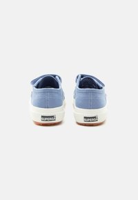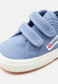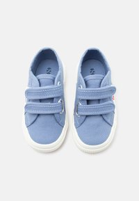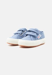 Hellblauer Canvas-Kinderschuh mit weißer Sohle, zwei Klettverschlüssen und "Superga" Markenetikett an der Seite.