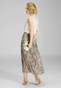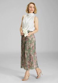 Blonde Frau mit Bob-Frisur, ärmellosem weißem Oberteil und geblümtem, plissiertem Rock, hält grüne Stängel und steht vor neutralem Hintergrund.
