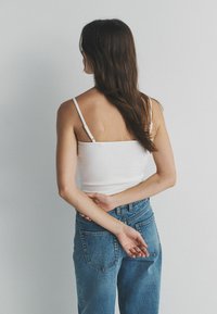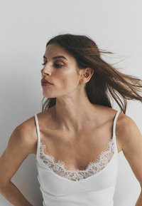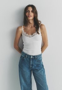 Frau lehnt entspannt an einer weißen Wand, sie trägt ein weißes Tanktop mit Spitzenbesatz, weit geschnittene blaue Jeans und braune Schuhe.