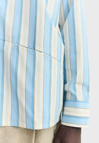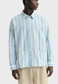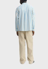 Junger Mann trägt ein locker sitzendes, langärmliges Hemd mit Knöpfen und vertikalen blauen, weißen und beigen Streifen, kombiniert mit hellfarbenen Hosen.