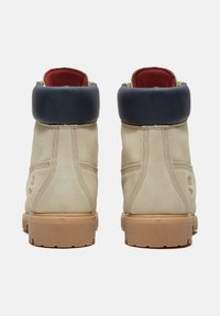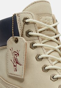 Beiger Schnürstiefel mit gepolstertem schwarzem Kragen, robuster hellbrauner Sohle und geprägt gestaltetem Baum-Logo an der Außenseite.