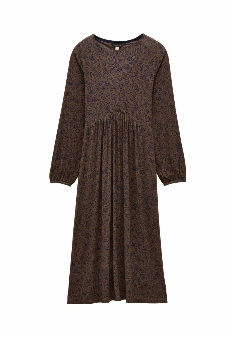 Braunes Midi-Kleid mit langen Ärmeln und dunklem floralen Paisley-Muster, Rundhalsausschnitt, geraffter Taille und elastischen Bündchen.