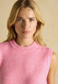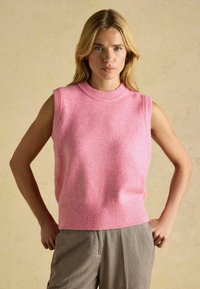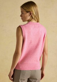 Ärmellose, rosa gestrickte Wollweste mit geripptem Ausschnitt, Armausschnitten und Saum, innen am Kragen mit dem Etikett "Joules" versehen.