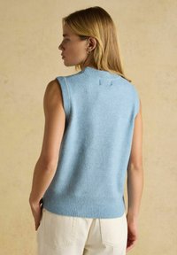 Hellblauer gestrickter ärmelloser Pullover mit geripptem Rundhalsausschnitt, Armausschnitten und Saum, innen am Kragen mit der Aufschrift "Joules".