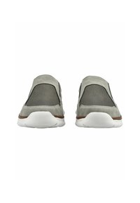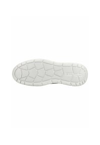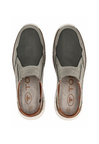 Leger grauer Slipper mit Mesh-Obermaterial, braunen Akzenten, mit "Tom Tailor" an der Seite und einer weißen belüfteten Sohle.