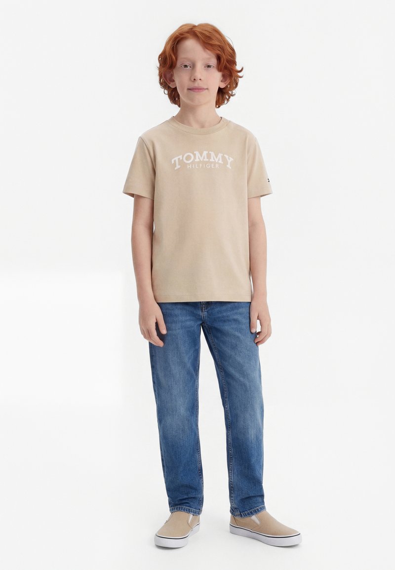 Rothaariges Kind steht, trägt ein beiges Tommy Hilfiger T-Shirt, blaue Jeans und beige Slipper auf weißem Hintergrund.