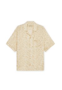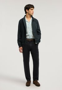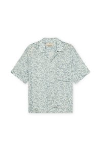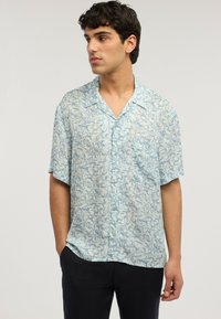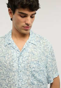 Mann trägt ein kurzärmliges hellblaues Hemd mit abstraktem Blumenmuster, schwarze Hose, Hände in den Taschen, schaut nach links.