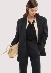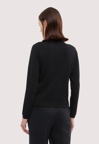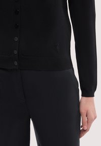 Frau mit glattem braunem Haar, die eine enganliegende schwarze, geknöpfte Strickjacke und schwarze Hosen trägt und mit einer Hand in der Tasche vor einem einfarbigen Hintergrund posiert.