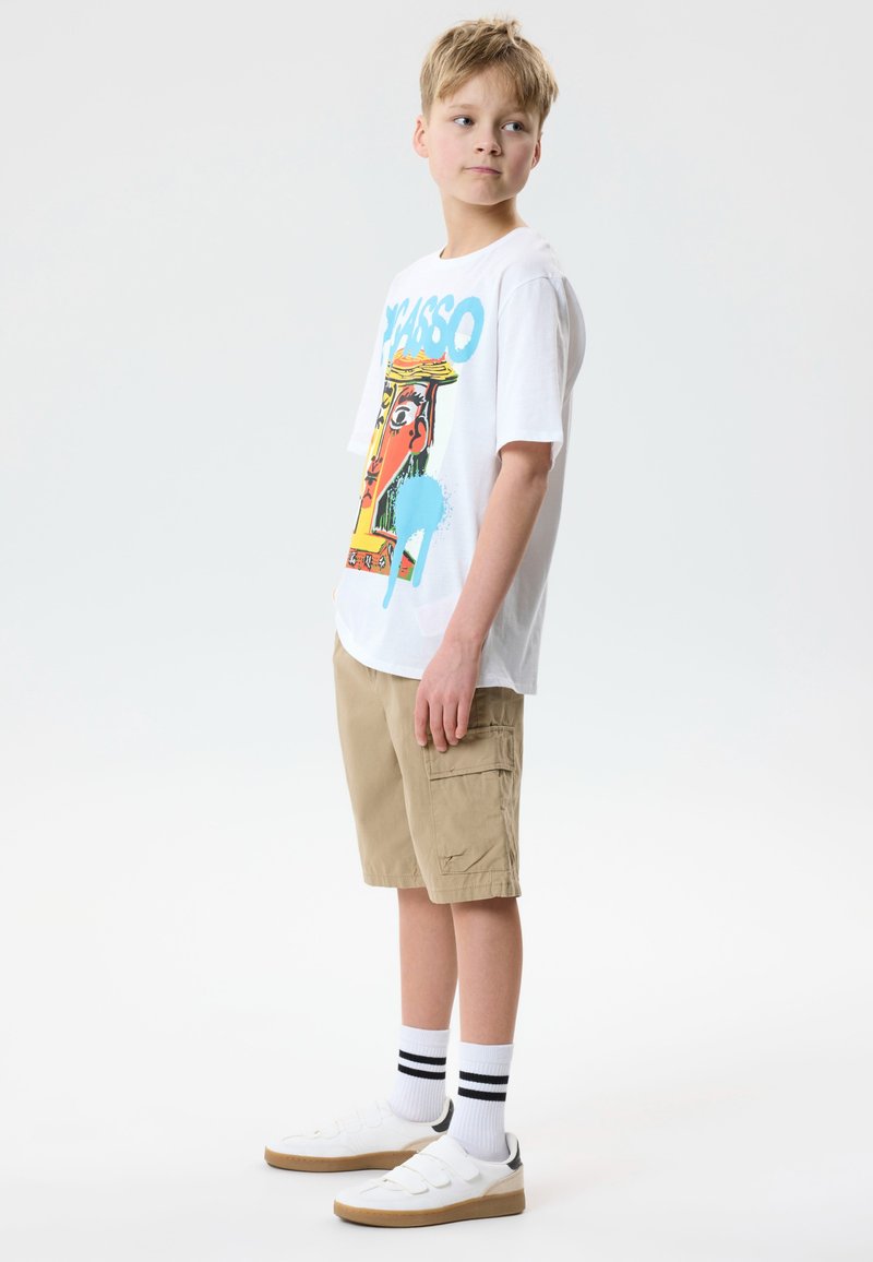 Blonder Junge steht, trägt ein weißes T-Shirt mit Picasso-Grafik, beigefarbene Cargo-Shorts, weiße Socken mit schwarzen Streifen und weiße Turnschuhe.
