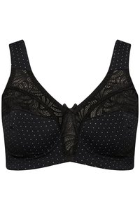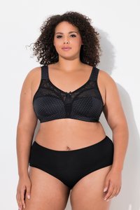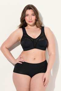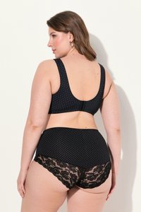 Plus-Size-Frau mit welligem Haar, die einen schwarzen Spitzen-BH mit Punkten und passende Unterwäsche trägt, posiert mit der Hand am Hals vor hellem Hintergrund.