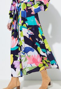 Frau trägt ein langärmeliges, buntes Maxikleid mit Blumen- und Vogelmuster, einem Kragen und Gürtel, kombiniert mit beigefarbenen Stiefeletten.