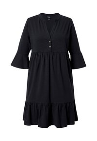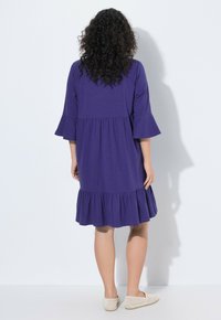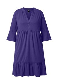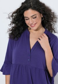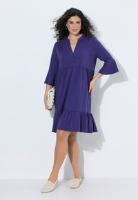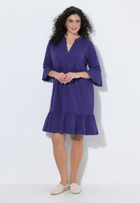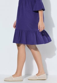Frau steht an einer weißen Wand und trägt ein locker sitzendes lila Kleid mit ausgestellten Ärmeln und Saum sowie beige Schlupfschuhe.