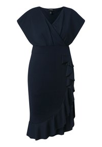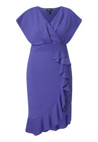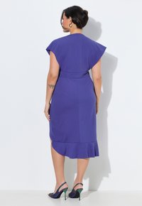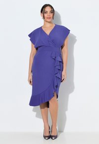 Frau trägt ein lila Wickelkleid mit Rüschen-Details an der Vorderseite des Rocks und kurzen Ärmeln, kombiniert mit schwarzen offenen Sandaletten.