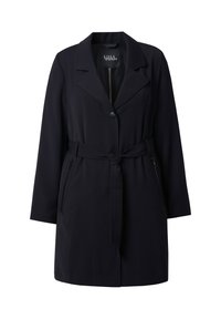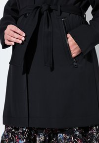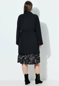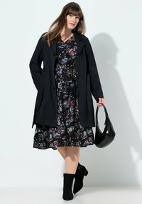 Frau steht und trägt einen schwarzen Mantel mit Gürtel über einem geblümten Kleid sowie schwarze Stiefeletten vor einem schlichten weißen Hintergrund.