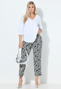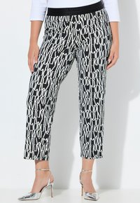Schwarz-weiße gemusterte Hose mit elastischem Bund, versehen mit auffälligen Textgrafiken. Der Stoff ist glatt und die Länge ist kurz geschnitten.