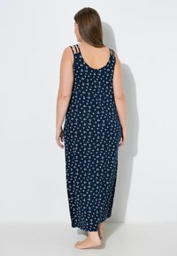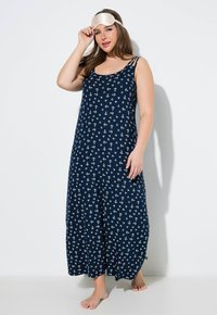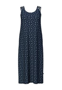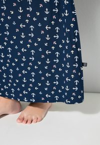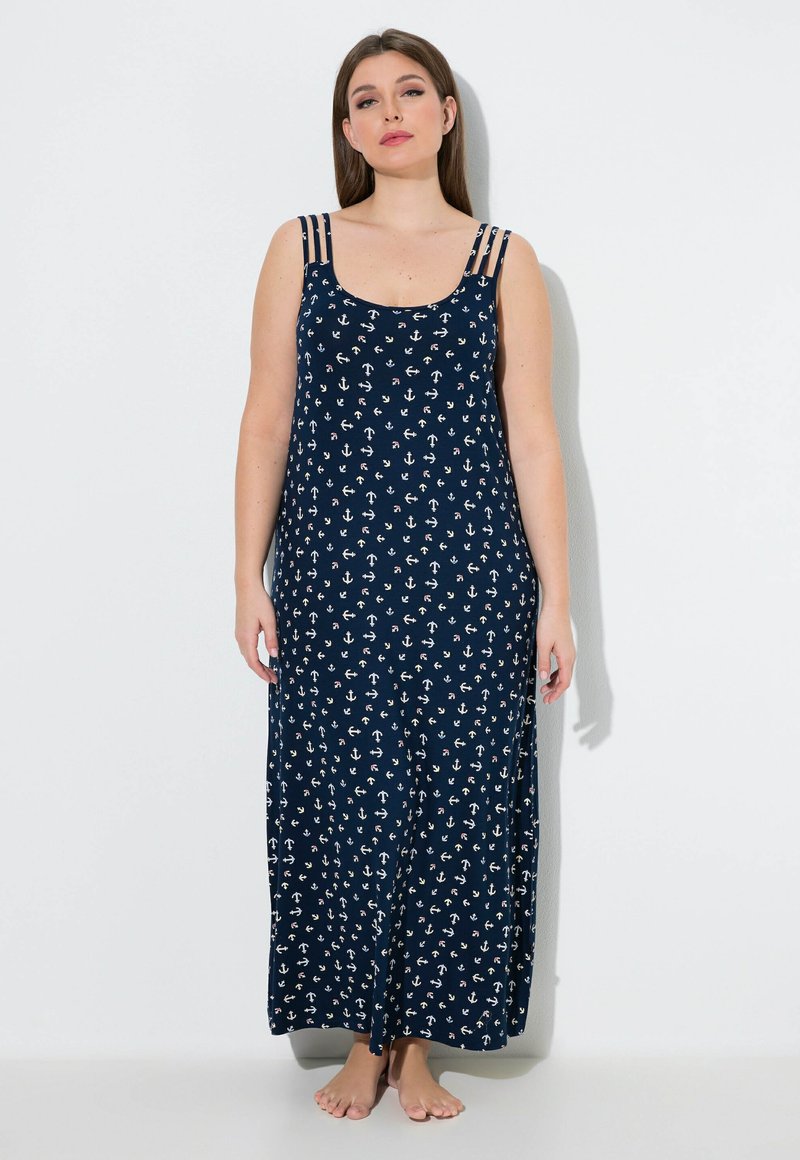 Frau trägt ein ärmelloses marineblaues Maxikleid mit weißen Anker-Mustern, steht barfuß vor einem schlichten weißen Hintergrund.