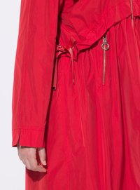 Frau trägt einen roten Kapuzenmantel mit Reißverschluss und Kordelzug in der Taille sowie schwarze enge Hosen, steht vor einem einfarbigen weißen Hintergrund.
