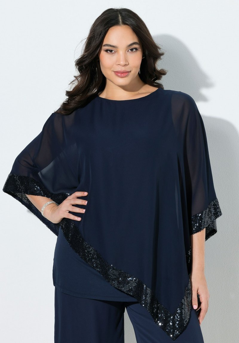 Frau mit dunklem, welligem Haar, die ein marineblaues, fließendes Oberteil mit transparenten Ärmeln und schwarzem Paillettenbesatz trägt und mit einer Hand in der Hüfte posiert.