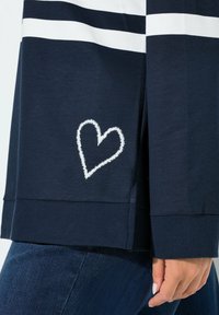 Langärmeliges, marineblau-weiß gestreiftes Oberteil mit rundem Ausschnitt und einem herzförmigen Akzent, der am unteren Saum aufgestickt ist. Glattes Baumwollmaterial.