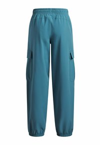 Türkisfarbene Cargo-Hose mit elastischem Bund, zwei seitlichen Taschen und lockerem Sitz. Hergestellt aus leichtem Material, entwickelt für Komfort und Bewegungsfreiheit.