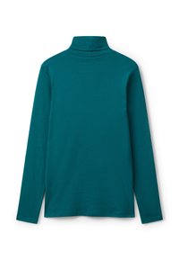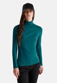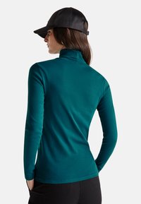 Frau, die einen türkisfarbenen Rollkragenpullover, schwarze Hosen und eine schwarze Baseballmütze trägt, steht vor einem weißen Hintergrund.
